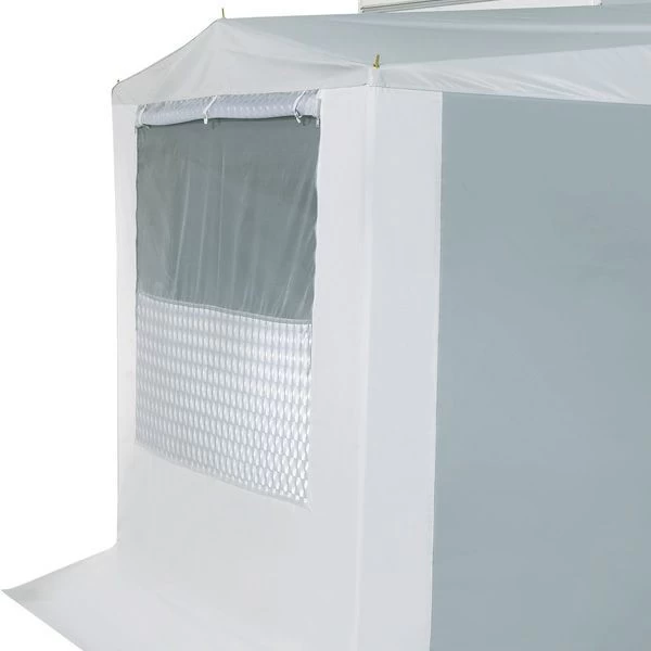 Dimensions: 2m x 1,5m. Les hauteurs de l’annexe varient en fonction de la hauteur au sol de l’auvent.