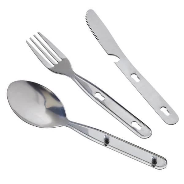Couverts de camping 3 pièces assemblées avec agrafe. Cuillère, couteau et fourchette en acier inoxydable. Très pratique pour les sorties rando, ski ou raquette.